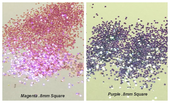 Solvent resistant 1mm colored iridescent square glitter. Available in 2 colors. These 2 square options coordinate with the hex colored iridescent glitters in Magenta and Purple.
