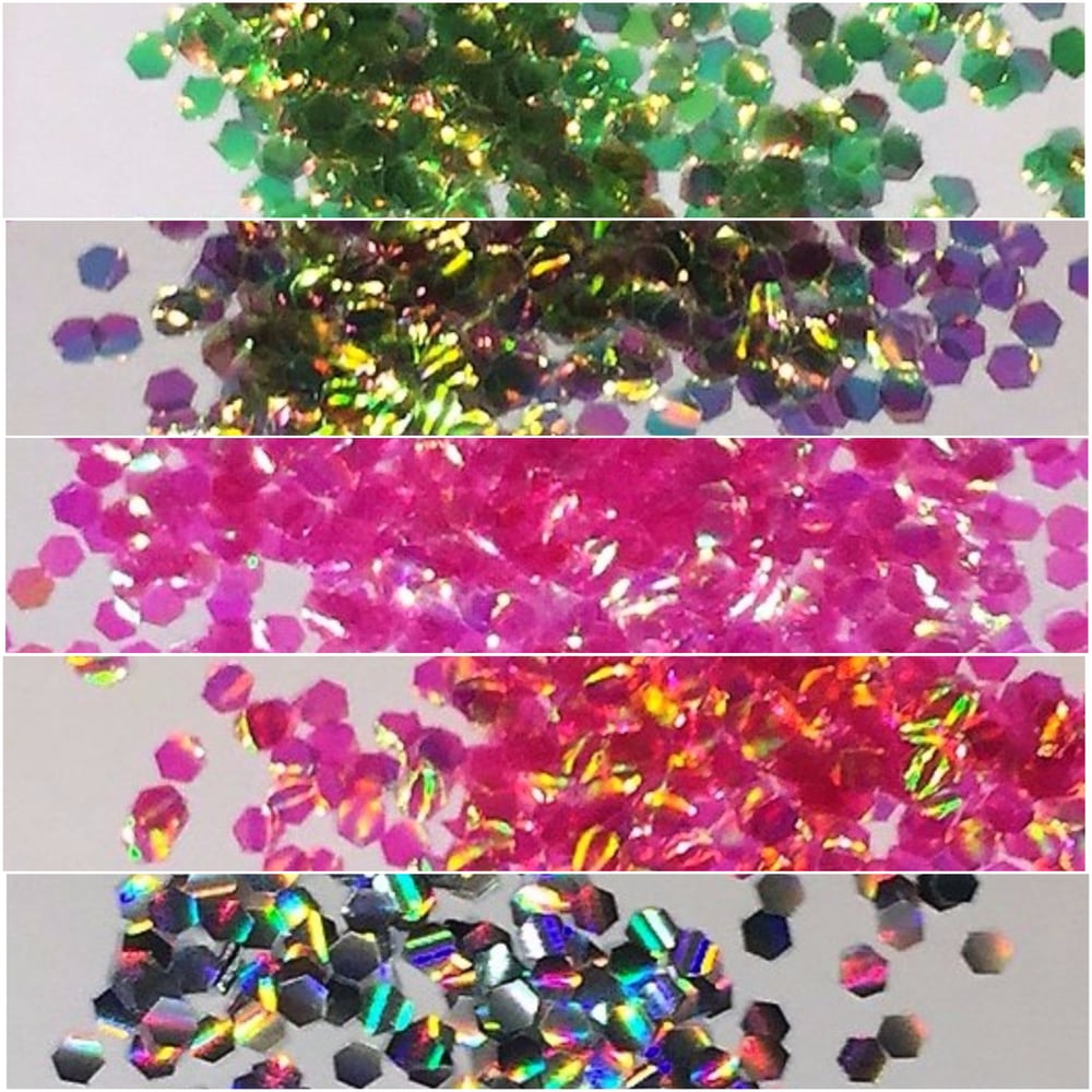 2mm iridescent fish-eye hex glitter. Available in 5 colors.