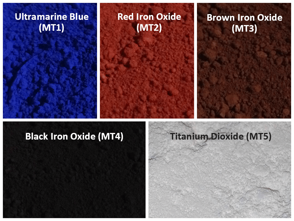 Matte colorant pigments, available in 13 colors -- Ultramarine Blue, Red Iron Oxide, Brown Iron Oxide, Black Iron Oxide, Titanium Dioxide (White), Manganese Violet, Ultramarine Violet, Ultramarine Pink, Chrome Red, Chrome Yellow, Cobalt Blue, Titanium Yellow and Chrome Green.